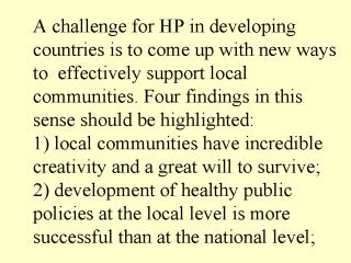 statistical data on morbidity and mortality; 4) Communities know which are the best choices for improving their health and quality of life, when opportunities are given to them by power structures.