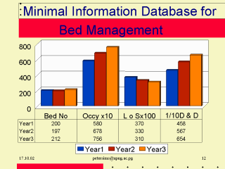 examines the efficiency of a Surgical Unit over 3 years. In this time the bed numbers have altered slightly. 1. The occupancy has increased from 58% to 78.6 (20.6%) 2. The Length of stay has been reduced by by 6 days (16%) 3. The Throughput increased from 4580/200 or 22.9 to 6540/212 or 30.8 i.e. an increase 7.9 (34%) |