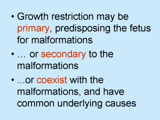 | The relationship between growth restriction and malformations may be explained by either the growth restriction being primary and predisposing the fetus to malformations, or as secondary to the presence of malformations, or by coexisting with a malformation due to common etiologic factor(s) |