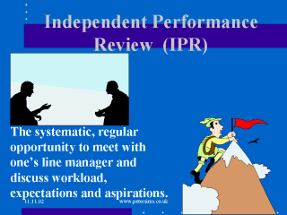 description forms the basis of IPR. The individual defines for each area of work. 2 or 3 Objectives Necessary Resources Interim Goals Review date These are then agreed with the supervisor/manager and the progress in each area and its objectives becomes the framework for the discussion with the supervisor at each Review meeting. |