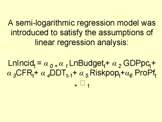 | Where t = subscript index for year (=1,2,3,4,5,6,7,8,9,10) Budgett = total budget for the national malaria control in Myanmar in the year t Incidt = annual malaria incidence in the year t GDPpct = gross domestic product per capita in the year t CFRt = case fatality rate of malaria in Myanmar in the year t DDTt-1 = DDT used (kg) in Myanmar for spraying in the year t-1 Riskpopt = proportion of population residing in risk area in the year t ProPft = proportion of P. falciparum in the year t Ln = logarithmic to the base e of the relevant variable a 0.... a 6 = parameters˜ = error terms |