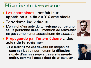 public officials, e.g. the killing of a president or ruler. Terrorism has become a statement. Arthur H. Garrison, How the World Changed: a History of the Development of Terrorism, presented at Delaware criminal Justice Council Annual Retreat, Oct 28-29, 2001 |