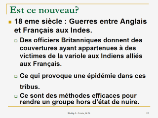 and Biological Terrorism, an overview of the threat. Phillip L. Coule, M.D. In the United States at the time of the French and Indian War, the British provided tainted blankets to Indians with the goal of disabling the opposing forces. |