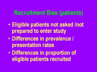 potential difficulties recruiting a representative sample of patients: All eligible patients may not be prepared to enter, or may not be asked to enter, the study. Observed variability in recruitment rates may be due to differences in the prevalence of disease or presentation rates but, variability in recruitment rates is likely to be also due to differences in proportion of eligible patients who were recruited. Interpretation of these differences requires access to records of all patients within participating practices who have the relevant disease but, it is rarely possible to obtain consent to access records from all patients not entering trials. The study denominator and the representativeness of the sample can be determined by comparing patient and disease related characteristics of participants with those of total eligible population using anonymised data. However, this is not always feasible as not all practices routinely record all consultations on computer and manual searches of paper records are costly. |
