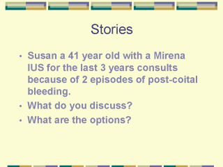 She wants to have a coil as. She doesn’t like the idea of Depot. Rose, a 30 year old married researcher, has always used condoms but wishes to avoid the mess. She wants children but her partner is less keen. |