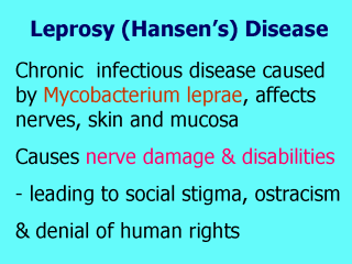 If not detected and treated early, 10%-15% of patients develop sensory-motor disabilities of hands, feet and eyes.(Non-Communicable component of Public health program) www.who.int/lep/disease/disease.htm The disease causing germs Mycobacterium leprae were discovered in 1873. Specific treatment-DAPSONE was available only after 1950. www.who.int/lep/disease/Microbiology/micro.htm |