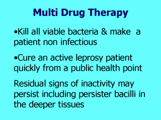 bacterial pool in the community. Residual signs such visible skin lesions, bacterial debris in the skin will be taken care by host immunity. Treatment regimen are suited even most difficult situations. www.who.int/lep/disease/disease.htm |
