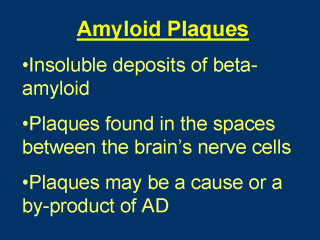 deposits of beta-amyloid - a protein fragment snipped from a larger protein (amyloid