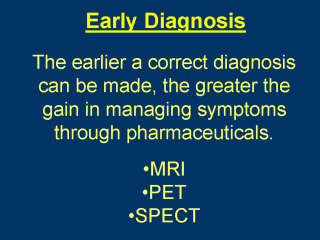 imaging techniques can diagnose AD correctly nearly 90% of the time. Magnetic Resonance Imaging can measure the size of various structures in the brain. Atrophy of the Hippocampus or other regions may be an early sign of AD. Positron Emission Tomogrophy, and Single Photonemission Computed Tomography are able to visualize the activity in particular brain regions while they are being used during cognitive operations (e.g. memorizing, recalling, speaking, reading, etc.) Reduced activity may be indicative of brain atrophy or nerve cell damage associated with AD. |