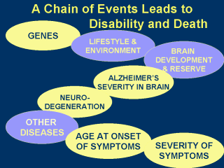agreed to donate their brains to the research project. Numerous studies based on this population have been published. For information go to www.mc.uky.edu/nunnet/ Based on this research, Snowdon theorizes, and many other researchers agree, that AD develops as the result of a complex cascade of events that take place over many years. If you can intervene and weaken or break any of these links in the chain, the disease may be prevented or its severity diminished. |