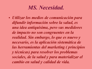 | Al respecto, el MS, a pesar de ser relativamente nuevo en cuanto a su enfoque global, está obteniendo buenos resultados y, por consiguiente, se está convirtiendo gradualmente en una parte importante de las proyecciones y programas de salud en países de avanzada, en cuanto a sus indicadores y calidad de vida. |