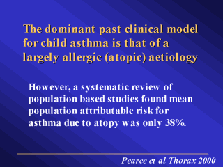 Atopy refers to the allergic disposition of an individual. In many large epidemiological surveys, a positive (>3mm) wheal response to one of a battery of allergenic substances on skin prick testing is used to classify a child as atopic. The review by Pearce et al suggests that the proportion of child asthma cases due to atopy is less than half at the population level. |