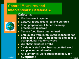 interventions at cafeteria A. The kitchen was inspected, leftover food was recovered and