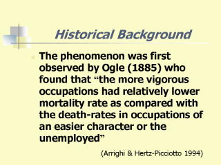 | The phenomena was observed in 1885 when William Ogle found that mortality rates is depending on the difficulty of the work where some occupations may repeal, while others may attract the workers. |