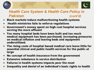health workers, further undermine those systems. Health ministries fail to enforce regulations that they themselves have created or are supposed to implement in the public interest. Government’s money is often spent on high cost hospital services that disproportionately serve the more affluent urban sector. Unfortunately, expensive diagnostic and treatment services consume funds that could instead provide essential and cost-effective public health and clinical services Too many hospital beds have been built and too much medical equipment has been purchased, increasing pressures on medical inflation and leaving beds and equipment underutilized. The rising costs of hospital-based medical care leave little for essential clinical and public health services for the public at large No concept of health insurance from the government. Private insurance that is available to only a small and affluent minority. The impact of failures in health systems is most severe on the poor, who are driven deeper into poverty by lack of financial protection against ill- health Without a health insurance safety net, many families have to pay more than 100 percent of their income for health care when hit with sudden emergencies. In other words, illness forces them into debt. The poor are treated with less respect, given less choice of service providers and offered lower- quality amenities. The poor pay a higher percentage of their income on health care than the rich. Inequality and denial of an individual's basic rights to health |