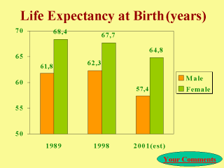 expectancy was 61.8 years for men and 67.5 years for females, one of the lowest in the WHO