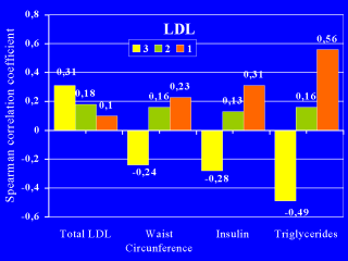 of LDL Size (Spearman) with Selected Variables. L1 is dense LDL. L1 is not correlated with total LDL. Level of dense LDL (L1) is primarily determined by being high waist circumference, insulin level, triglycerides, and CRP. Dense LDL (L1) is strikingly inversely correlated with HDL cholesterol. HDL cholesterol theory may be in some way related to the density of lipoproteins.