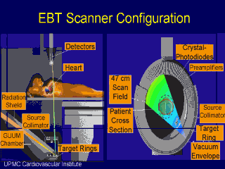 | The electron beam is generated by an electron source and then focused onto one of four tungsten target rings lying in the gantry beneath the patient. Each 210o sweep of the electron beam on a target ring produces a 30 degree fan beam of x-rays that pass through the patient to detectors above, producing a cross-sectional image. |