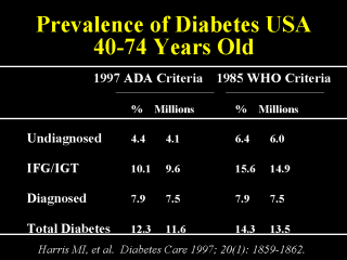 | Revised criteria for diagnosis of Diabetes and Impaired Fasting Glucose (IFG) was introduced by ADA in 1997. Consequently different people are considered as diabetics as a result of this changes. We are not changing the rates considerably, but we changed the people. |