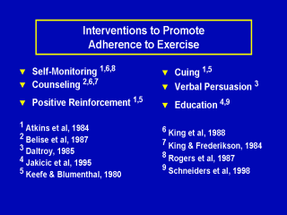 | If we look at exercises by the same types of interventions that we utilized in studies - self-monitoring, counseling, positive reinforcement, cuing, verbal persuasion and education - one begins to think that all the docs who get involved in the adherence field have come out of the same kinds of training backgrounds. |