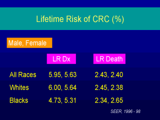 | Colorectal cancer is a very common disease. As you can see, the lifetime risk of diagnosis is about 6%, the lifetime risk of death is about 2.5%, and there’s about 130,000 cases a year. This is a disease that’s very high in terms of a public health perspective. |