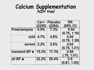 | The bottom line was that nobody benefited from therapy in this study. There was no reduction of preeclampsia, however sever; no change in transient blood pressure, another name for gestational hypertension; and interestingly, there was really no difference in blood pressure in this study, unlike any other study that had been done previous. So in this very elegant, very expensive, and very well-controlled study, there was no evidence of benefit of calcium supplementation. |