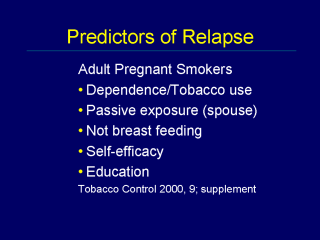 | Across randomized controlled studies of adult pregnant smokers, these predictors of relapse were noted. Tobacco dependence, passive exposure, and low self-efficacy were consistent predictors of relapse across the few RCT studies of these adult smokers. |