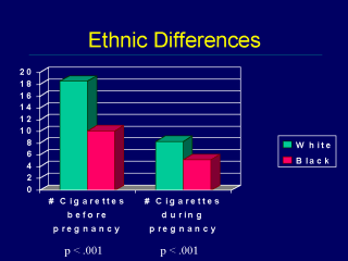 pregnancy. White pregnant teens smoked significantly more before and during the pregnancy than their African American counterparts. Furthermore, White teens initiated smoking and started smoking regularly earlier than African American teens. White teens had a greater percentage who thought they were strongly addicted to cigarettes. However, the self-reported pattern of cigarette inhalation was similar between White and African American pregnant teens. |