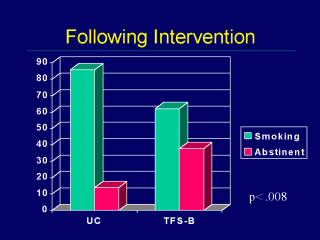 | Smoking behavior was not statistically different between Usual care and the TFS group or between TFS and TFS-Buddy following intervention. However, immediately following intervention delivery, the group assigned to TFS with a buddy was had significantly higher abstinence rates than the usual care group. |