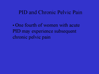 | But infertility, even though it’s what we focus on most when we talk about PID, is not the whole story. In fact, these women have a lot of other chronic morbidity, which is really very burdensome. One thing is that they very frequently have chronic pelvic pain. It’s estimated that up to one fourth of women who have had PID experience chronic pelvic pain, and that comes from the Scandinavian data. |