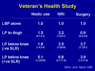 | People this is a male who have LBP only. They are clearly scoring much higher than the men who have any leg pain associated and actually most of the differences between the red and the other colors are statistically significant. So once leg pain comes into the equation the person’s health status is much lower. At this age, we’ve seen mental health status and we’re seeing physical health status, BP is bodily pain and GH is general health. In the physical pain, general health and mental health. |