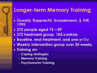 found one where longer-term memory training was used. Here’s somebody who took 375 people, divided them into a treatment group and into some controls and worked with people over 30 weeks time. Had a baseline, had an end-treatment, and had a one-year follow-up. Trained people on coping strategies, memory training, and some psychomotor training. |