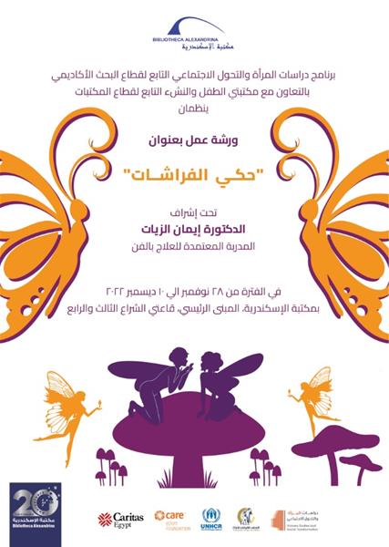 The BA Program for Women Studies and Social Transformation in cooperation with Children and Young People Libraries, National Council for Women, The UN High Commissioner for Refugees, Care Egypt Foundation, And Caritas Egypt are organizing “butterflies storytelling” workshop and theatrical show from the 29 of November to the 6th of December 2022. The workshop aims to discover the skills and strength points of the women participating in the event through acquiring them the skills of acting, writing, and storytelling to help them express their problems and getting liberated from its impacts that blocking their social and economic progress.