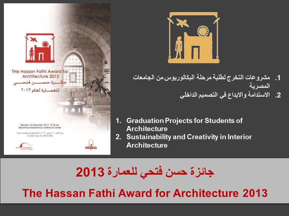 وقد خصصت جائزة حسن فتحي لهذا العام لأعمال طلبة أقسام العمارة والتخطيط بكليات الهندسة بالجامعات المصرية الحكومية والخاصة، والتي لا تحظى بالاهتمام الكافي نظراً لانحصارها داخل الكليات الأكاديمية والاقسام المعمارية ولا ينشر منها إلا قدر محدود في بعض المجلات المعمارية المحلية وبعض المواقع الإلكترونية. وفاز بالجائزة الذهبية مشروع التخرج المقدم من مروة كامل عبد الحميد السيد من كلية الهندسة، جامعة فاروس بعنوان تطوير المناطق العشوائية بالإسكندرية بعزبة الصيادين بالمكس. وفاز بجوائز استحقاقية كل من سارة محمد أمين حمادة من كلية الهندسة جامعة الاسكندرية عن مشروع مركزفنون الباليه بالإسكندرية، وعمرو محمد سامي العدوي من الأكاديمية العربية للعلوم والتكنولوجيا، كلية الهندسة والتكنولوجيا عن مشروع بوابة أبو قير الحضرية، واحمد ربيع محمد حامد من الاكاديمية الحديثة بالمعادي، كلية العمارة وتكنولوجيا البناء عن مشروع محطة مترو القاهرة (نظرية الفوضى) وهاشم احمد هاني هاشم الاكاديمية الحديثة بالمعادي، كلية العمارة وتكنولوجيا البناء عن مشروع ناطحة جبل (الروح المعلقة)، وأخيرا دعاء محمود اسماعيل أبو بكر من كلية الفنون الجميلة، جامعة حلوان عن مشروع مجمع سكنى مستدام بواحة سيوة.