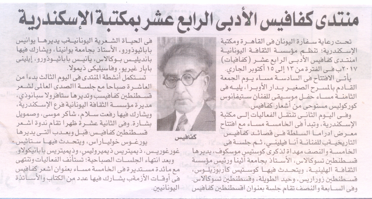 كفافيس الدولي في الأوبرا ومكتبة الإسكندرية وموسيقى مستوحاة من أشعاره في حفل الافتتاح October 05, 2017 Al-Ahram Al-Masaei