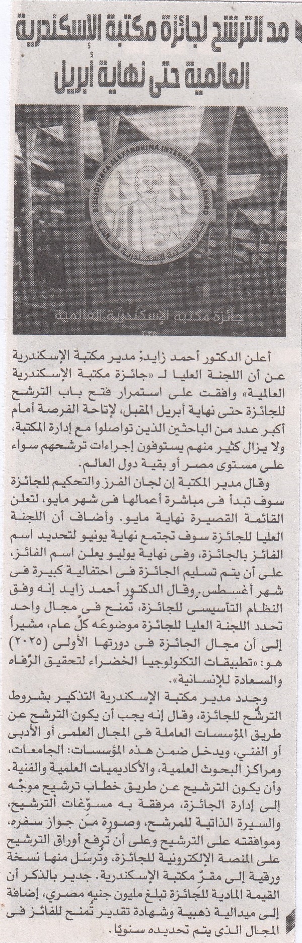 مد الترشح لجائزة مكتبة الإسكندرية العالمية حتى نهاية إبريل