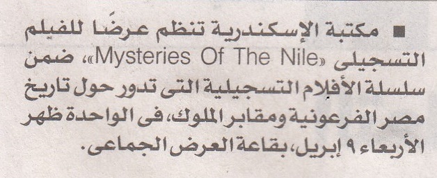 مكتبة الإسكندرية تنظم عرضاً للفيلم التسجيلي"Mysteries Of The Nile"