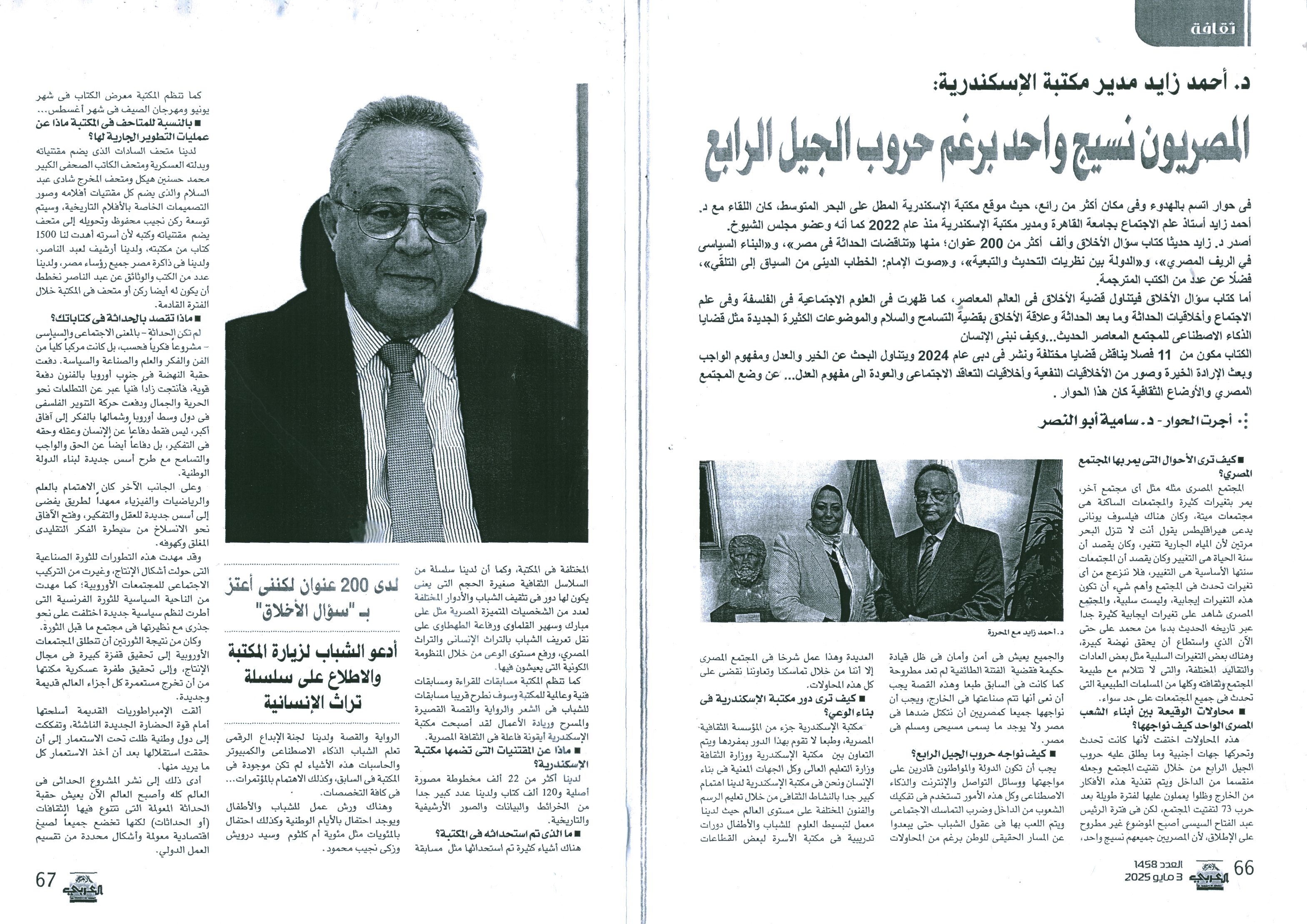03 مايو 2025 د. أحمد زايد مدير مكتبة الإسكندرية: المصريون نسيج واحد برغم حروب الجيل الرابع الأهرام العربي