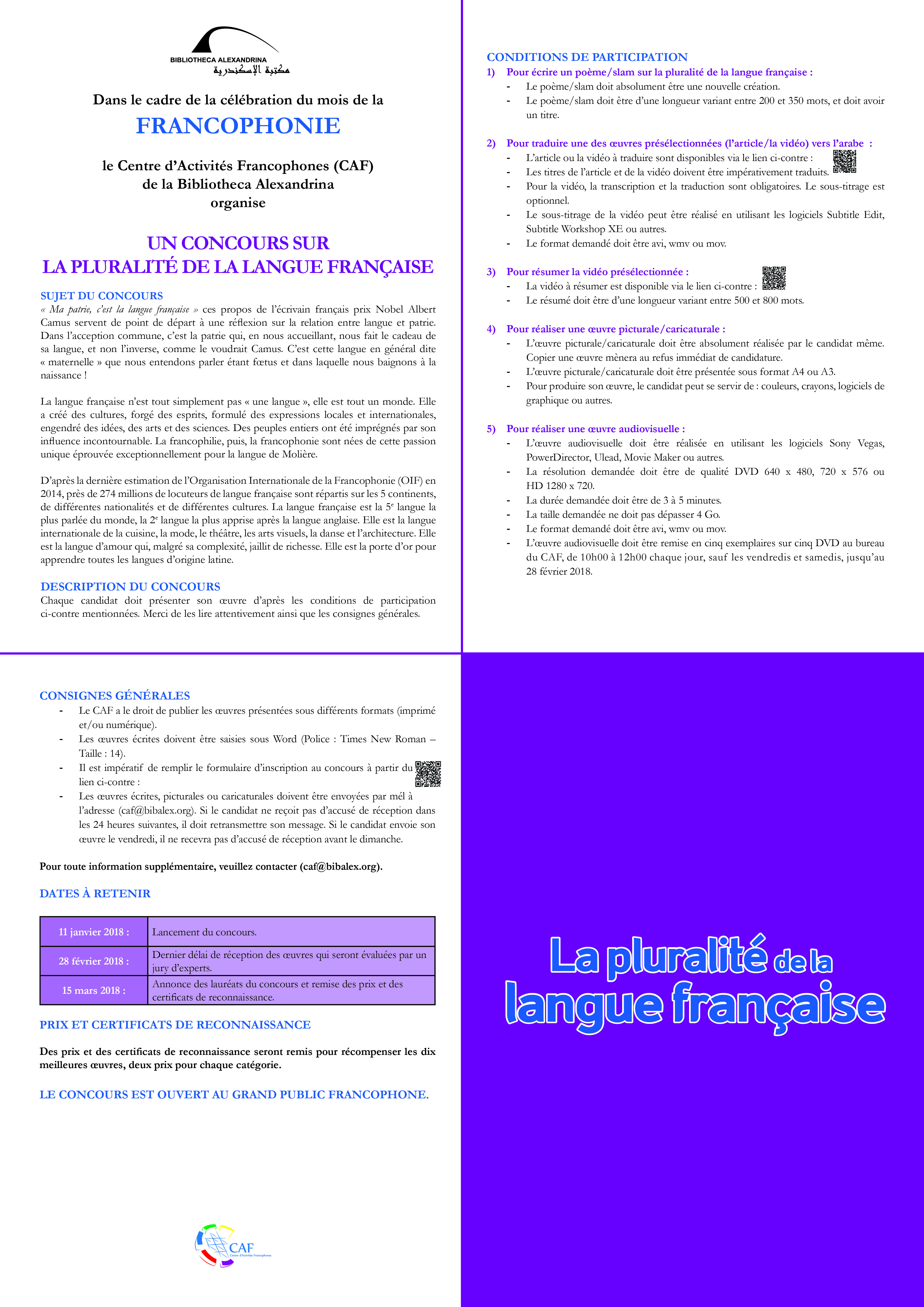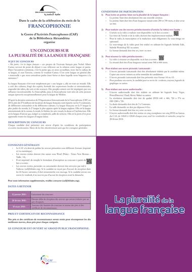 Dans le cadre de la célébration du mois de la Francophonie le Centre d’Activités Francophones (CAF) de la Bibliotheca Alexandrina organise UN CONCOURS SUR LA PLURALITÉ DE LA LANGUE FRANÇAISE