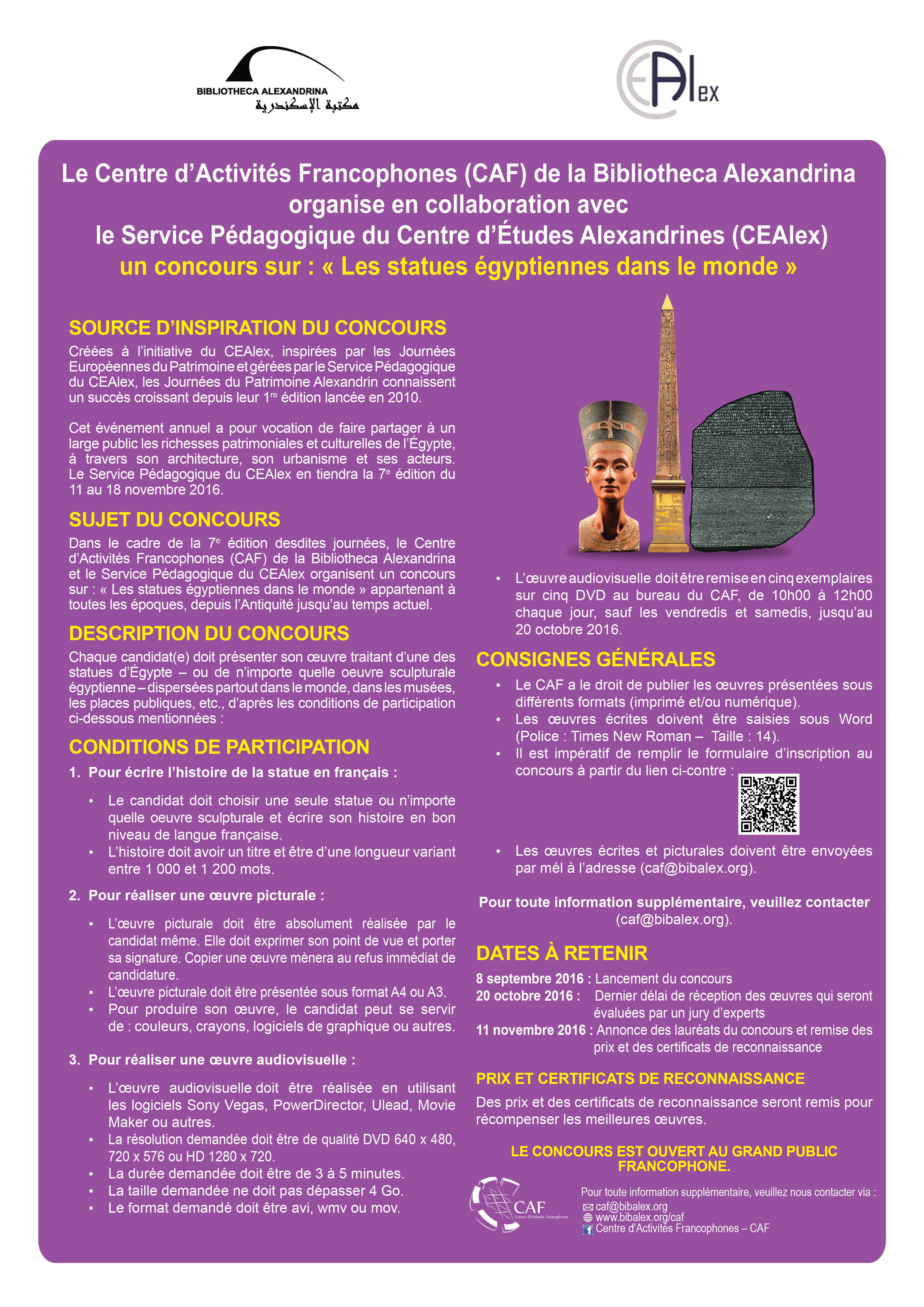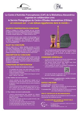 Le Centre d’Activités Francophones (CAF) de la Bibliotheca Alexandrina organise en collaboration avec le Service Pédagogique du Centre d’Études Alexandrines (CEAlex) un concours sur « Les statues égyptiennes dans le monde ».