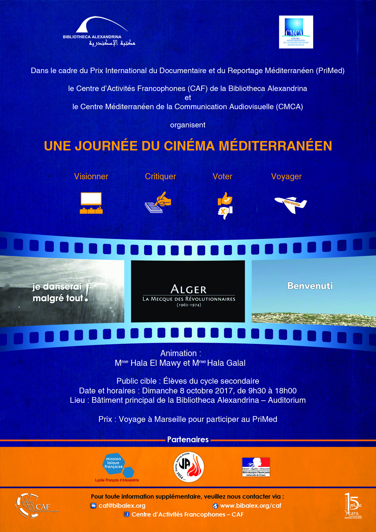 Dans le cadre du Prix International du Documentaire et du Reportage Méditerranéen (PriMed), le Centre d’Activités Francophones (CAF) de la Bibliotheca Alexandrina et le Centre Méditerranéen de la Communication Audiovisuelle (CMCA) organisent " UNE JOURNÉE DU CINÉMA MÉDITERRANÉEN "