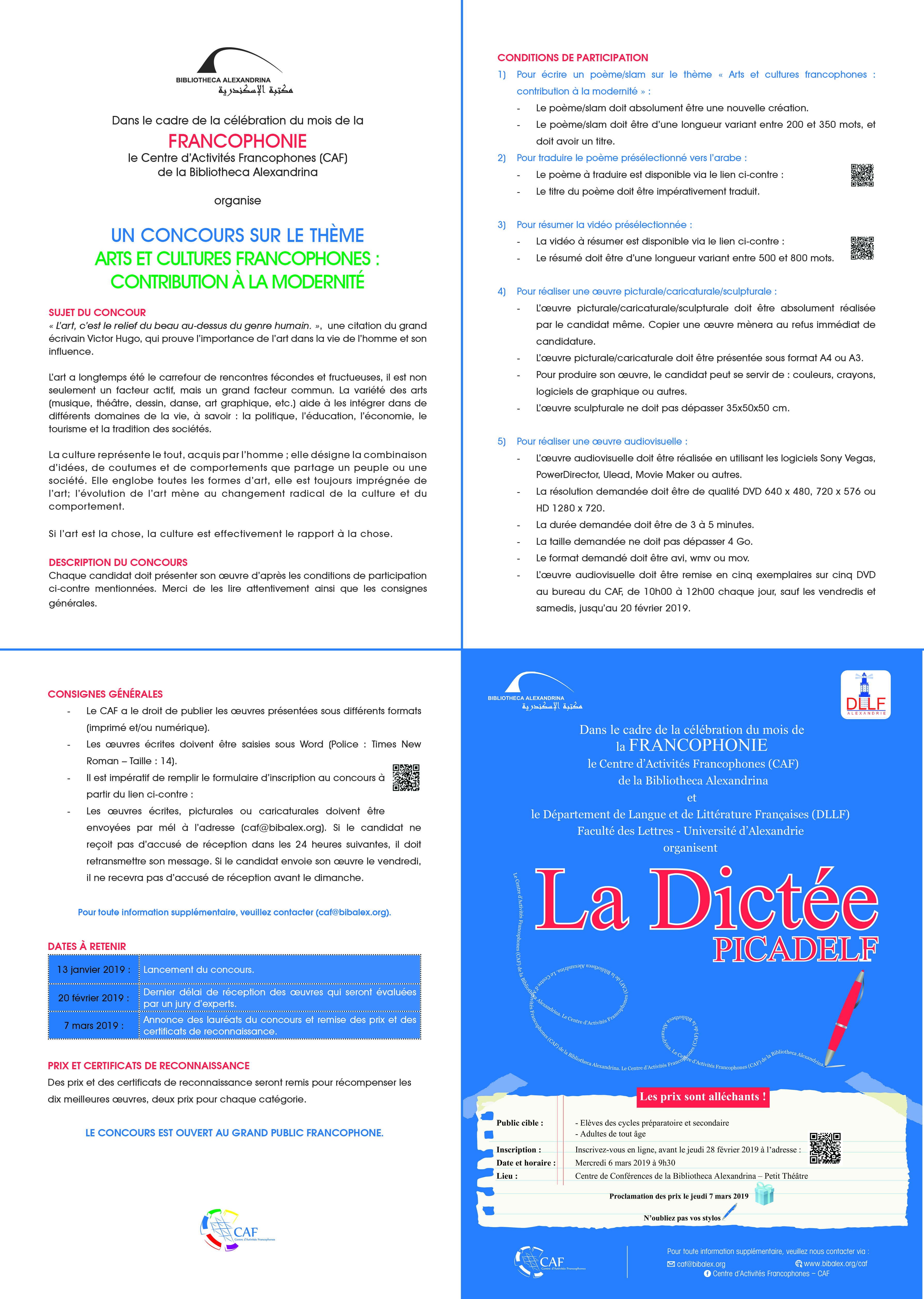 Dans le cadre de la célébration du mois de la Francophonie, le Centre d’Activités Francophones (CAF) de la Bibliotheca Alexandrina organise UN CONCOURS SUR LE THÈME "Arts et cultures francophones : contribution à la modernité"