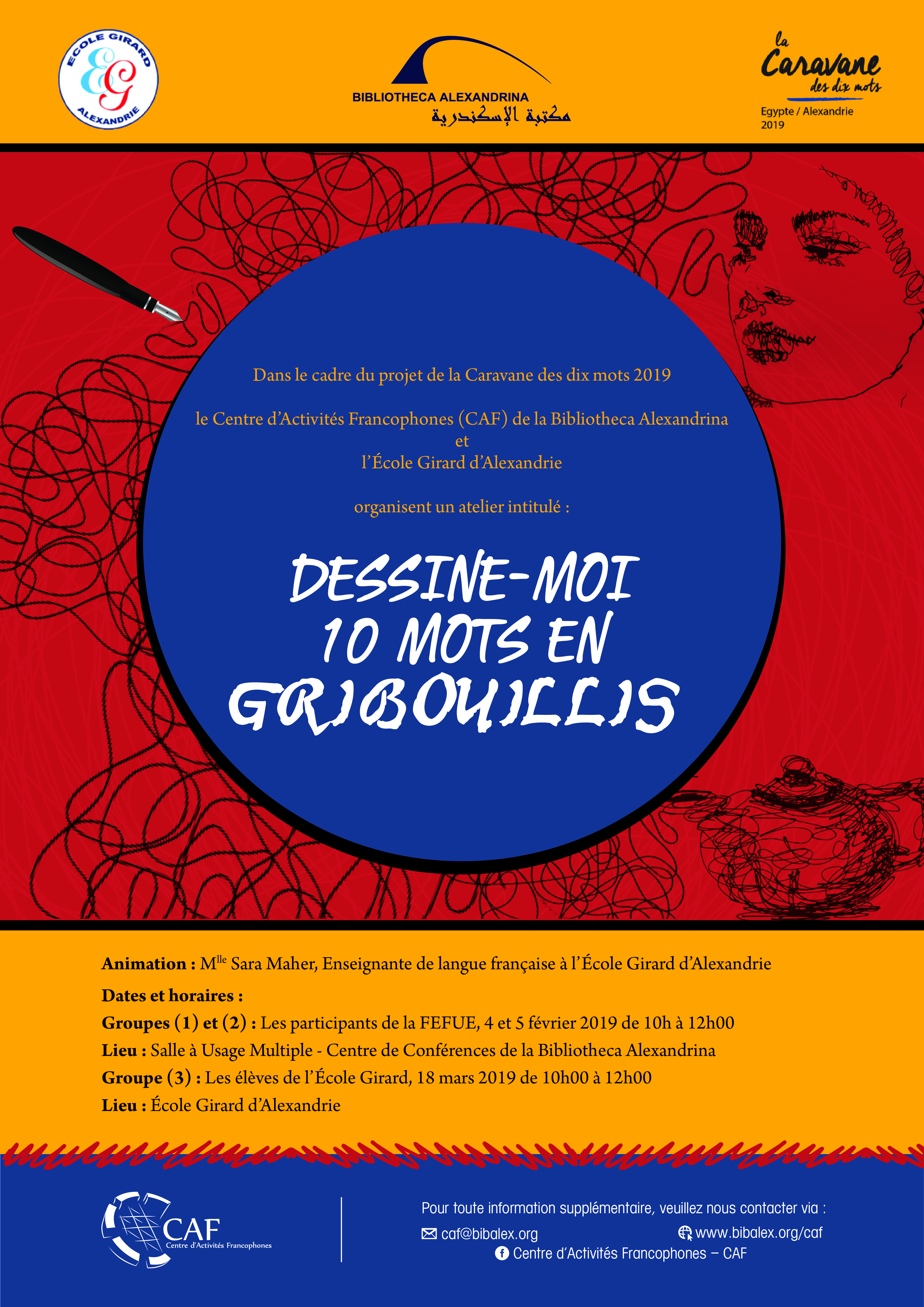 Dans le cadre du projet de la Caravane des dix mots 2019, le Centre d’Activités Francophones (CAF) de la Bibliotheca Alexandrina et l’école Girard organisent un atelier intitulé : DESSINE-MOI 10 MOTS EN GRIBOUILLIS
