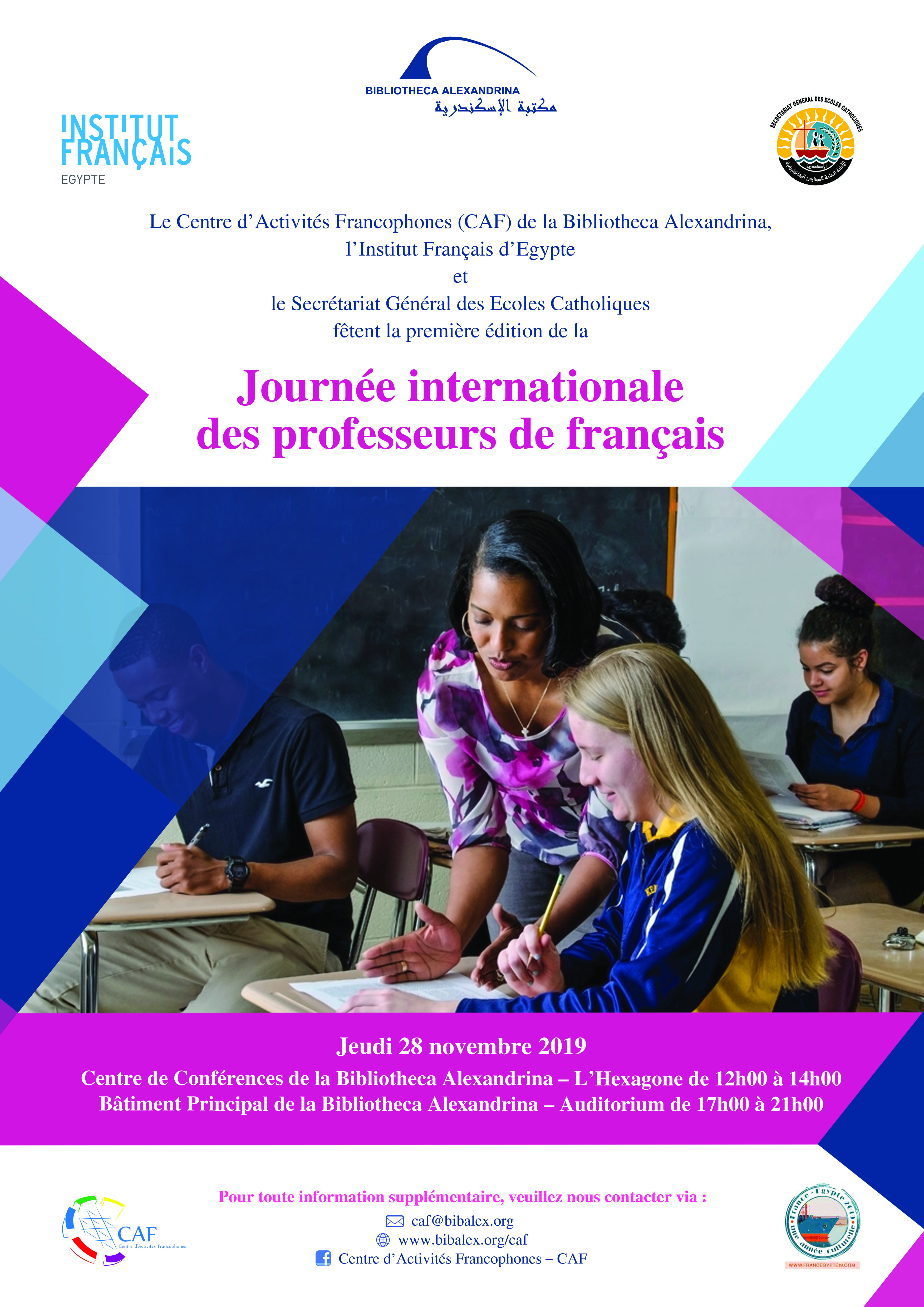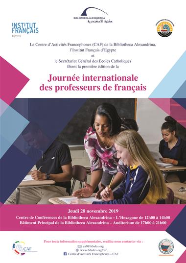 Le Centre d’Activités Francophones (CAF) de la Bibliotheca Alexandrina en collaboration avec l’Institut Français d’Egypte et le Secrétariat Général des Écoles Catholiques fêtent la première édition de la Journée Internationale du Prof de Français