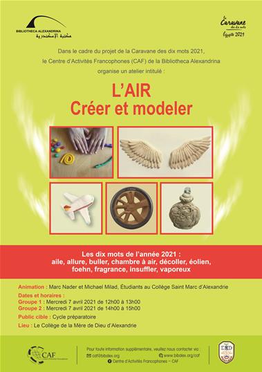 Dans le cadre du projet de la Caravane des dix mots 2021, le Centre d’Activités Francophones (CAF) de la Bibliotheca Alexandrina organise un atelier intitulé : L’AIR : Créer et modeler
