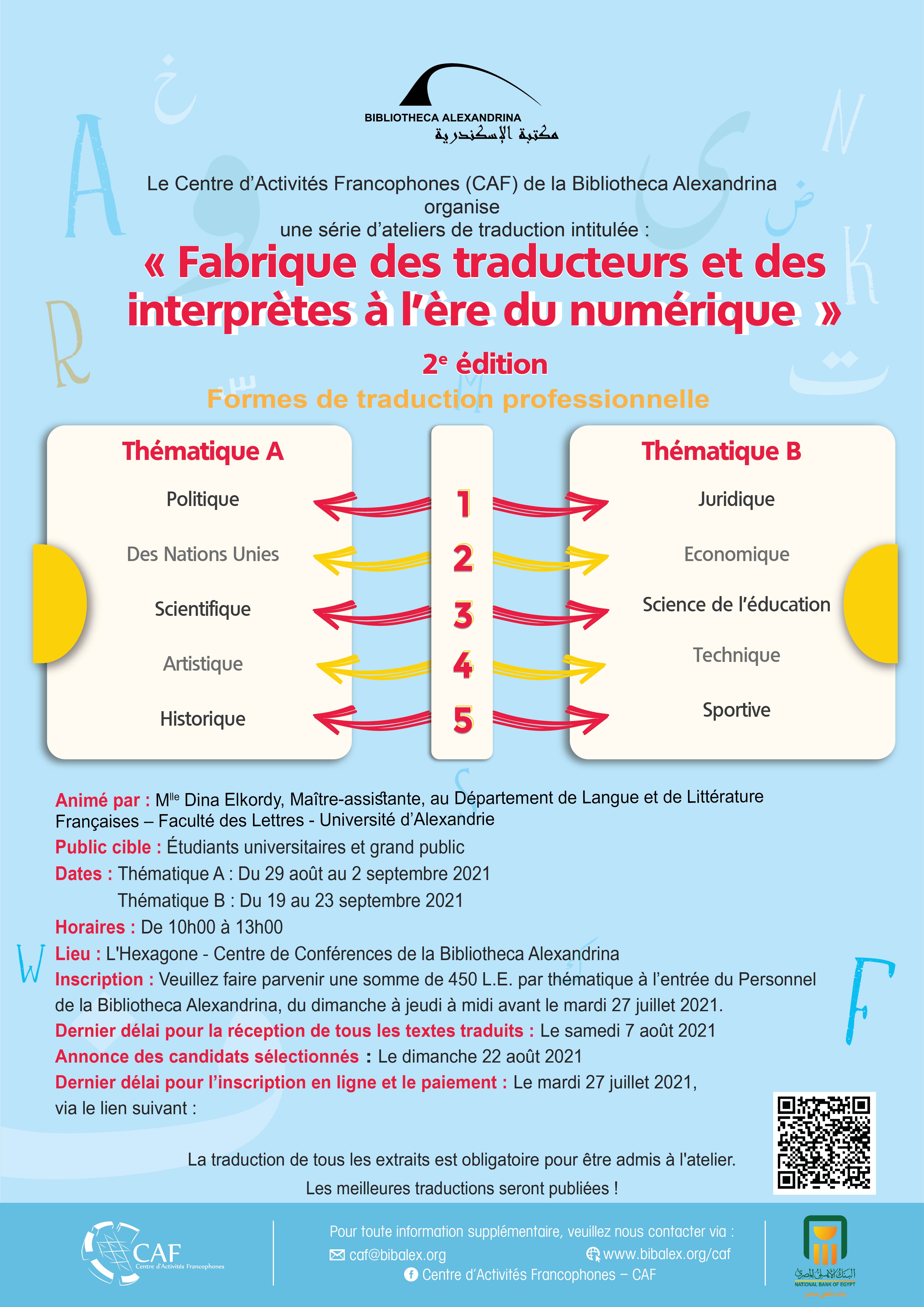 Le Centre d’Activités Francophones (CAF) de la Bibliotheca Alexandrina organise une série d’ateliers de traduction intitulée :