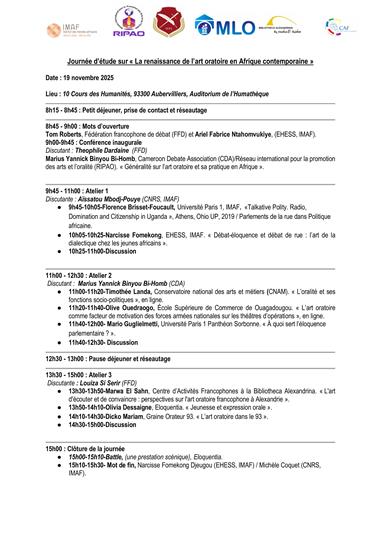 Cette conférence s’est tenue lors de la journée d’étude intitulée « La renaissance de l’art oratoire en Afrique contemporaine ». Cette dernière est organisée par l’Institut de mondes africains (IMAF) et autres partenaires pour explorer les nouvelles perspectives et les enjeux de l’art oratoire dans le contexte africain contemporain.