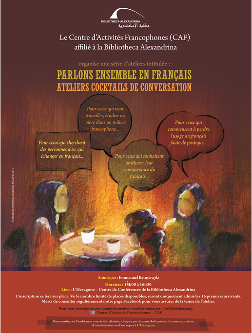Le Centre d’Activités Francophones (CAF) affilié à la Bibliotheca Alexandrina organise une série d'ateliers intitulée : « Parlons ensemble en français : Ateliers cocktails de conversation »