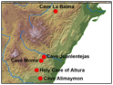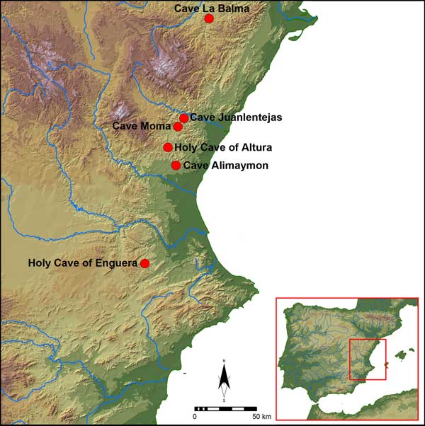 In the eastern Iberian Peninsula, there are around twenty sacred caves and sanctuary caves from the Middle and Modern Ages. The caves of Islamic origin with Mudejar and Moorish tradition such as The Cave of Jualentejas: Fuentes de Ayodar, Castille: eighth to ninth centuries, the Cave of Alimaymon: Olocau, Valencia ninth: to fifteenth centuries and the Cave of the Moma: Pavias, Castellon: eleventh to sixteenth centuries. The caves of Christian tradition such as The Holy Cave of Enguera, Valencia: eleventh, twelfth and seventeenth centuries, the Holy Cave of Altura, Castellón: sixteenth to twenty-first centuries and the Sanctuary of Our Lady of La Balma: Zorita del Maestrazgo, Castellón: fourteenth to twenty first century.