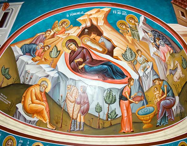 [Mural in the Church of John the Baptist by the River Jordan, representing the birth of Christ in a cave]